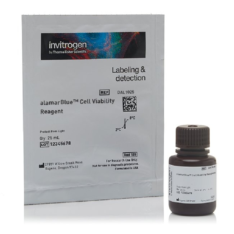 alamarBlue Cell Viability Reagent is a ready-to-use resazurin-based solution that functions as a cell health indicator by using the reducing power of living cells to quantitatively measure viability. Resazurin, the active ingredient of alamarBlue reagent, is a non-toxic, cell-permeable compound that is blue in color and virtually non-fluorescent. Upon entering living cells, resazurin is reduced to resorufin, a compound that is red in color and highly fluorescent. Changes in viability can be easily detected using either an absorbance- or fluorescence-based plate reader. alamarBlue Cell Viability Reagent has broad applicability and can be used with various human and animal cell lines, bacteria, plant, and fungi.