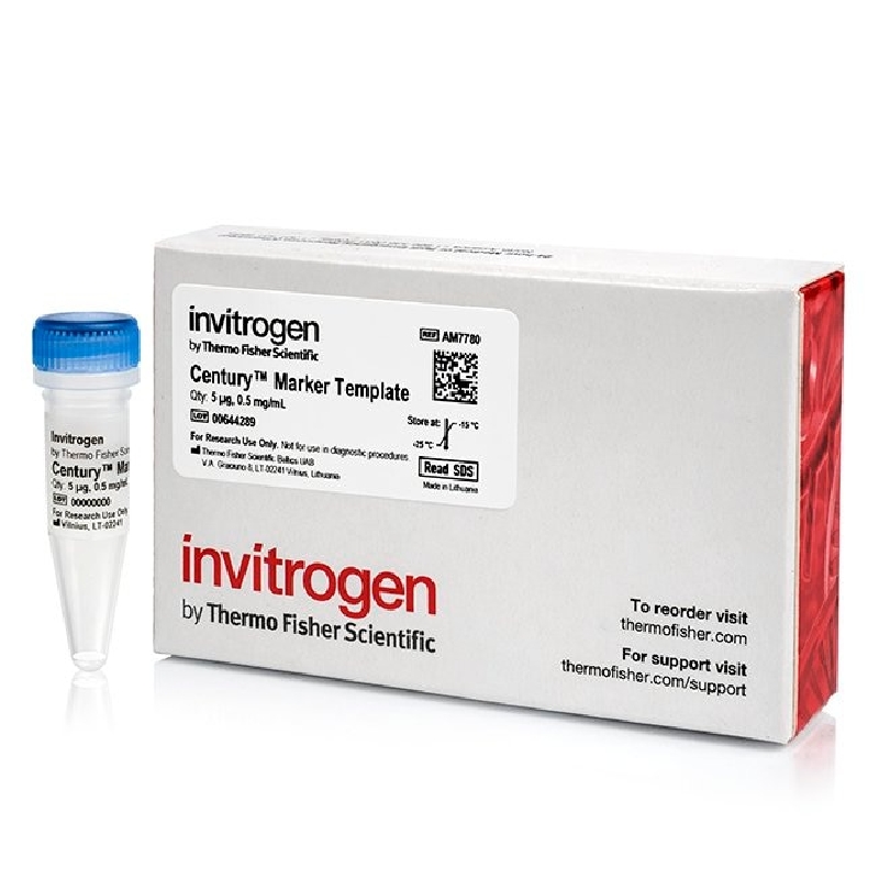 Ambion® Century™ Marker Templates contain mixtures of linearized plasmids ready for use as templates in in vitro transcription reactions for synthesis of labeled RNA molecular size standards. When transcribed with T7 RNA polymerase, the templates produce 5 RNA transcripts with the lengths of 100, 200, 300, 400, and 500 bases. They can be labeled with radioisotopes, biotin, or other nonisotopic modified nucleotides. They are ideal as size standards for ribonuclease protection assays and other applications where a low molecular weight RNA ladder is useful.