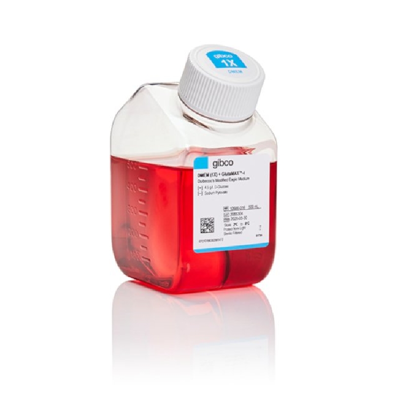 DMEM is unique from other media as it contains 4 times the concentration of amino acids and vitamins than the original Eagle's Minimal Essential Medium. DMEM was originally formulated with low glucose (1 g/L) and sodium pyruvate, but is often used with higher glucose levels, with or without sodium pyruvate. DMEM with GlutaMAX™ supplement minimizes toxic ammonia build-up and improves cell viability and growth in an easy-to-use format. DMEM contains no proteins, lipids, or growth factors. Therefore, DMEM requires supplementation, commonly with 10% Fetal Bovine Serum (FBS). DMEM uses a sodium bicarbonate buffer system (3.7 g/L), and therefore requires a 5–10% CO2 environment to maintain physiological pH.