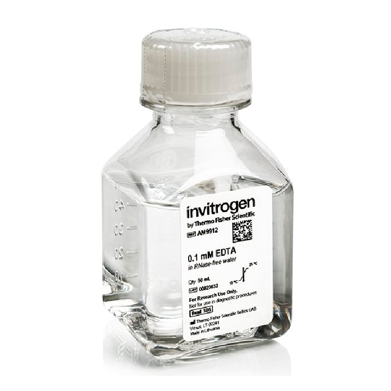 Ambion® 0.1 mM EDTA is a commonly recommended storage solution for RNA samples. 0.1 mM EDTA is in nuclease-free, ultrapure water. It is provided in one bottle of 50 mL. The last step in every RNA isolation protocol is to resuspend the purified RNA pellet. After painstakingly isolating the RNA, it is crucial that the pellet be suspended and stored in a safe, RNase-free solution. 0.1 mM EDTA is prepared from the purest reagents available, under scrupulously monitored conditions in a state-of-the-art manufacturing facility. It is then subjected to rigorous quality control procedures to guarantee their purity and performance.