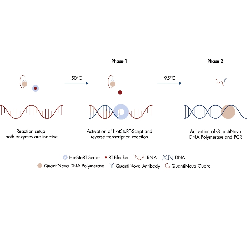 At ambient temperature the HotStaRTScript is inhibited by the RT-Blocker and the QuantiNova DNA Polymerase is kept inactive by QuantiNova Antibody and QuantiNova Guard. At 50°C the RT is activated while the QuantiNova DNA polymerase remains inactive. At 95°C the RT enzyme is denatured and the DNA polymerase is activated.