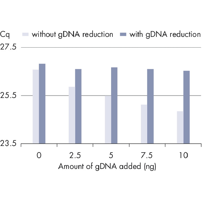 Total HeLa RNA (10 ng/rnx) samples were spiked with increasing amounts of human genomic DNA. Expression of MGAT1 was analyzed by qRT-PCR. MGAT1 is a single-exon gene that does not allow the discrimination of RNA and gDNA by assay design. Without the gDNA reduction step, Cq values decreased linearly, falsely indicating an increase in expression rate. In contrast, the expression levels remained similar when using the gDNA reduction step.