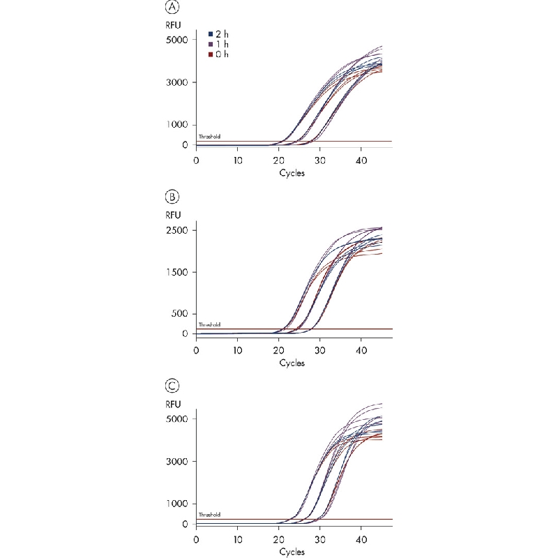Real-time RT-PCRs including master mix, template RNA, primers and probes for [A] GAPDH, [B] MYC and [C] HSP90AA1 were left at room temperature (22°C) for 1 h and 2 h. These samples were run in parallel to freshly prepared reactions (set up on ice) on the Bio-Rad CFX 384 instrument. Duplicate reactions of 3 different template amounts were tested. The Cq values provided by the QuantiNova Probe RT-PCR Kit did not vary after extended storage of the samples at room temperature.