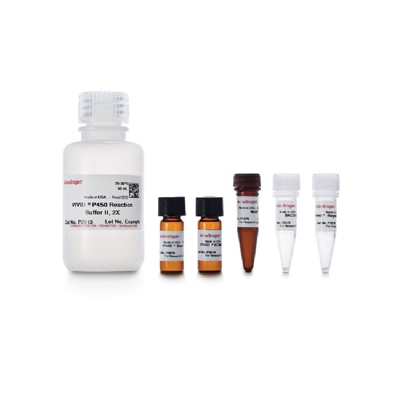Vivid® CYP450 Screening kits include Vivid® CYP450 Fluorogenic substrates, BACULOSOMES® CYP450 reagents, fluorescent standards, and an NADPH-regeneration system. Vivid® CYP450 Fluorogenic substrates are also available separately. Store reaction buffers at +4°C or room temperature. Store BACULOSOMES®, the NADPH-regeneration system, and NADP+ at -80°C. Store the Vivid® substrates and standards at +4°C, protected from light. (For long-term storage, resuspend in organic solvent and keep at -20°C.) |