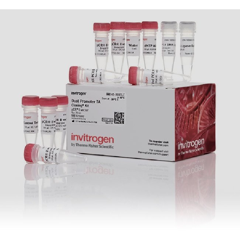 The TA Cloning® Kit Dual Promoter with pCR™II vector provides a quick, one-step cloning strategy for directly inserting a Taq-amplified PCR product into a plasmid vector. The T7 and Sp6 promoters of the pCR™II vector allow in vitro transcription of the insert to produce sense or anti-sense products. The TA Cloning Kit Dual Promoter uses the pCR™II cloning vector and ExpressLink™ T4 DNA Ligase to generate a ligation product in a fifteen-minute, room-temperature ligation step. Reactions typically yield >80% recombinants containing inserts.