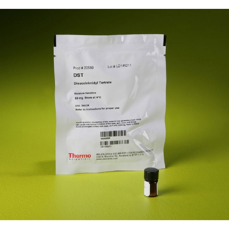 Thermo Scientific Pierce DST, also called disuccinimidyl tartrate, is a water-soluble crosslinker that contains amine-reactive NHS ester ends around a 4-atom spacer arm, whose central diol can be cleaved by periodate oxidation.