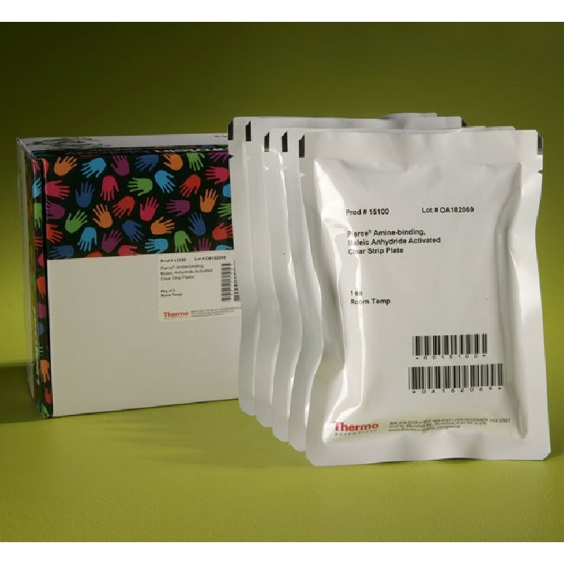These Thermo Scientific Pierce Maleic Anhydride Activated 8-Well Strip Plates are clear, 96-well strip plates that allow attachment of amine-containing peptides and other molecules to microplate wells for use in binding assays.