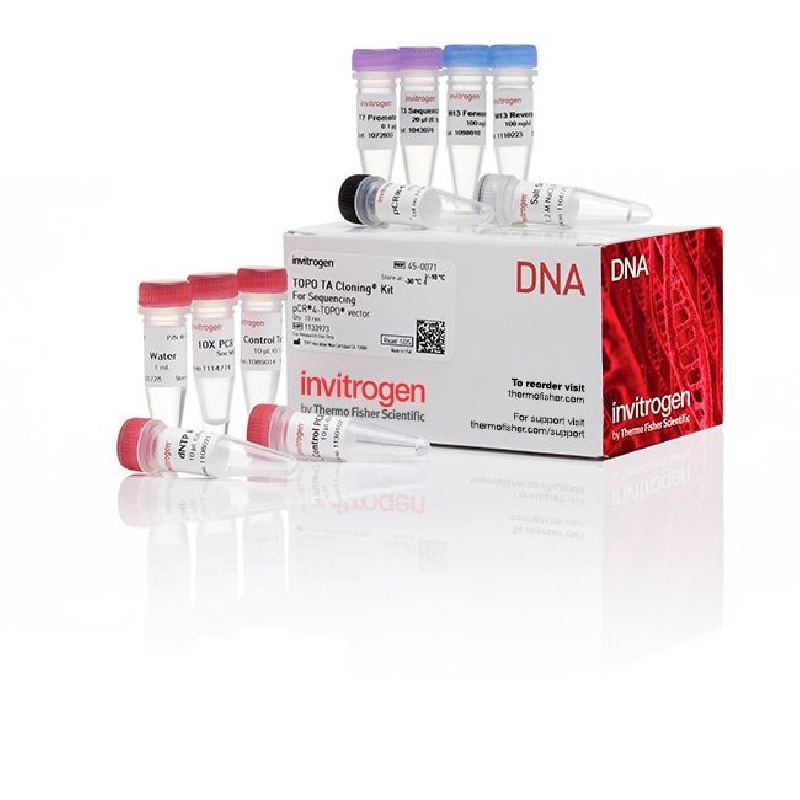 The TOPO® TA Cloning® Kits for Sequencing provide a highly efficient, 5-minute, one-step cloning strategy ('TOPO® Cloning') for the direct insertion of Taq polymerase–amplified PCR products into a plasmid vector for sequencing. Each kit uses the pCR™4-TOPO® TA vector with specially designed sequencing primer sites that return more insert sequence and less vector sequence from each reaction, and are available with a variety of competent cells, or no competent cells, depending on your needs and budget. These kits include everything necessary to clone and select recombinant vectors containing your PCR fragment of choice. Features of TOPO® TA Cloning® Kits for Sequencing: