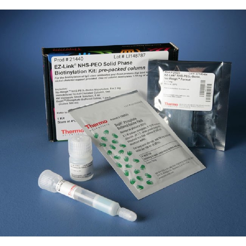 Thermo Scientific EZ-Link NHS-PEG Solid Phase Biotinylation Kits provide an on-column approach to amine-targeted antibody biotinylation that provides greater control over the labeling reaction and clean-up process.