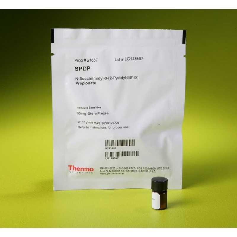 Thermo Scientific Pierce SPDP is a short-chain crosslinker for amine-to-sulfhydryl conjugation via NHS-ester and pyridyldithiol reactive groups that form cleavable (reducible) disulfide bonds with cysteine sulfhydryls.