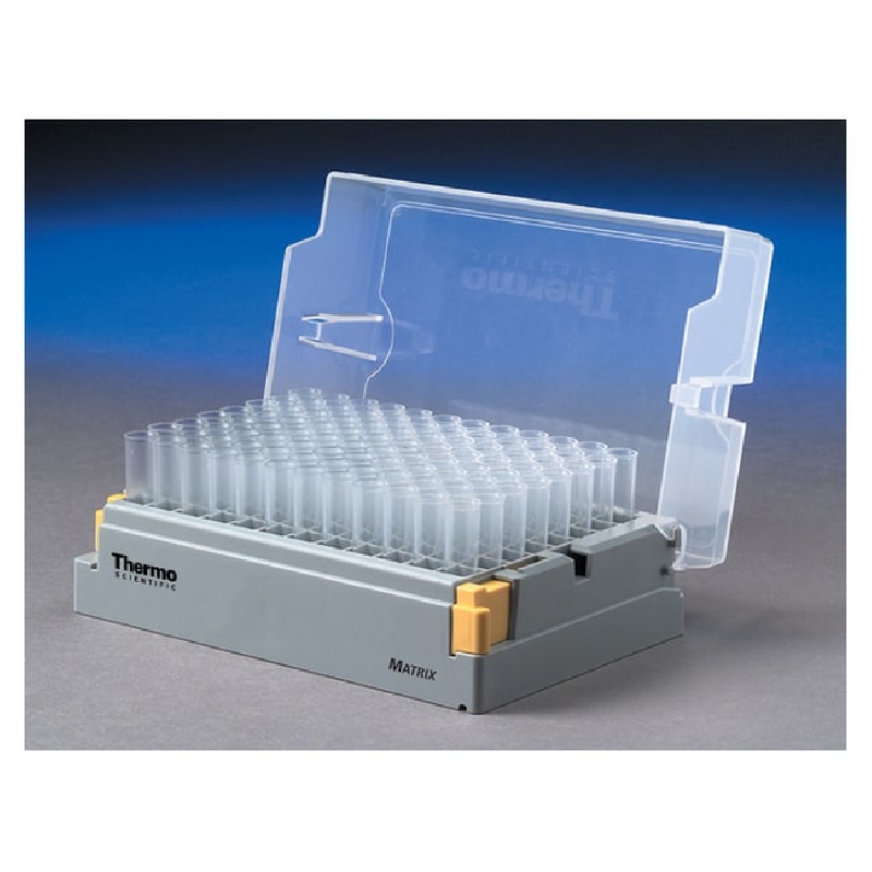 - 不同于传统的储存管或模块,Thermo Scientific Matrix 空白和字母数字储存管装在我们特别设计的可堆叠闩锁架中,该架的占用空间与微孔板相当,可放置96根管,以供个别取样、取放和取出