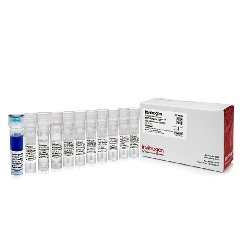 The MEGAshortscript™ T7 Kit is designed for high yields of in vitro- transcribed RNA products, in the 20–500 nucleotide range. Using conventional methods, transcription of small templates often results in low mass yields of RNA. Short transcripts require many more transcription initiation events to synthesize a given mass of product. Since the initiation step is the rate-limiting step in transcription reactions, the yield of product from short templates is often low. The MEGAshortscript™ T7 Kit has been designed to overcome the drawbacks involved in conventional in vitro transcription to maximize the yield of short RNA transcripts.
