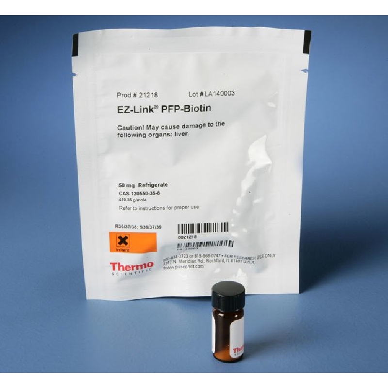 Thermo Scientific EZ-Link PFP-biotin is a pentafluorophenyl-ester biotinylation reagent that has similar properties to NHS-biotin but is more reactive and will target both primary and secondary amines for biotinylation.