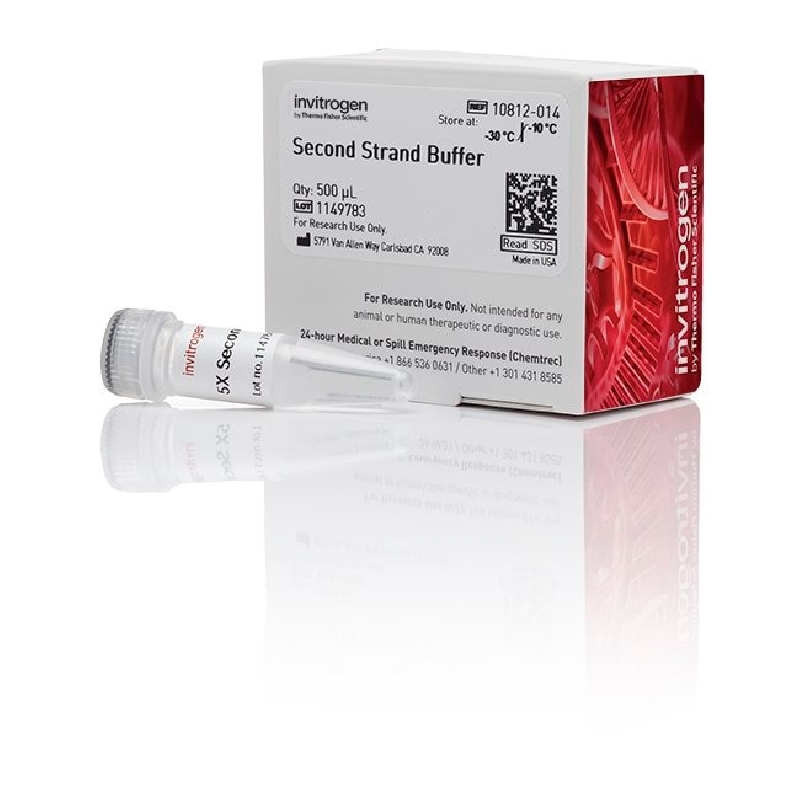Second Strand Buffer is used with SuperScript® cDNA Synthesis Systems to generate second-strand cDNA from mRNA in the first-strand reaction. It is supplied as a 5X concentrate and should be diluted 1:5 (1 part 5X Second Strand Buffer + 4 parts other components) prior to use.