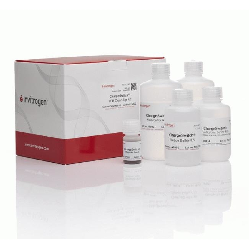 The ChargeSwitch® PCR Clean-Up Kit is shipped at room temperature. Upon receipt, store all components at room temperature. All components are guaranteed stable for 6 months when stored properly. Components: ChargeSwitch® Magnetic Beads (25 mg/ml in 10 mM MES, pH 5.0, 10 mM NaCl, 0.1% Tween 20) ChargeSwitch® Purification Buffer (N5) ChargeSwitch® Wash Buffer (W12) ChargeSwitch® Elution Buffer (E5; 10 mM Tris-HCl, pH 8.5) |