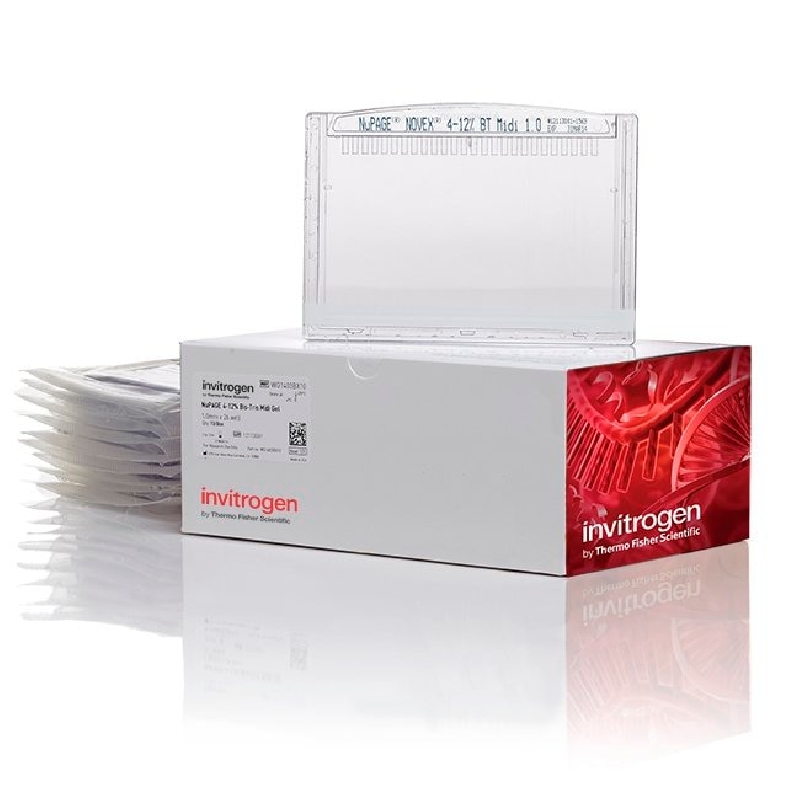 Obtain optimal separation of your proteins by choosing the right combination of gel and running buffer. NuPAGE Bis-Tris protein gels come in four polyacrylamide concentrations: 8%, 10%, 12%, and a 4–12% gradient. Gels come in two sizes: mini (8 cm x 8 cm) or midi (8.7 cm x 13.3 cm) and either 1.0 mm (mini and midi gels) or 1.5 mm (mini gel format only) in thickness. NuPAGE Bis-Tris gels also come in multiple well formats.