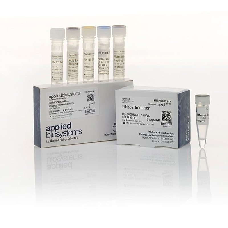 Contents: • 10X RT Buffer (2 × 1 mL) • 10X RT Random Primers (2 × 1 mL) • 25X dNTP Mix (100 mM, 1 mL) • MultiScribe® Reverse Transcriptase (1 mL at 50 U/µL) • RNase Inhibitor (5 × 0.2 mL at 20 U/µL) Store between -15°C and -25°C. |